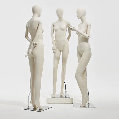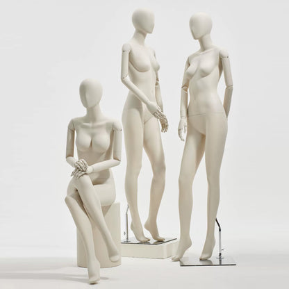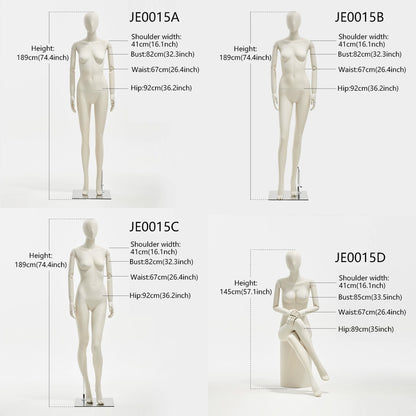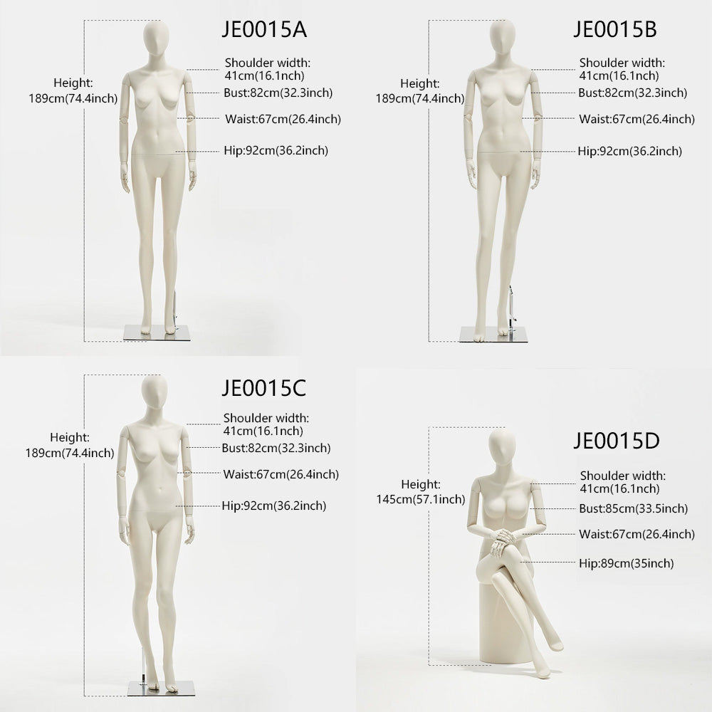 Create limitless styling possibilities with our high end JE0015 female full body mannequins, designed to bring stunning to any clothing boutique stores. Available in four variations—three standing poses female full body mannequins with silver square bases and one seated pose female full body mannequin with a matching stool—each mannequin features premium wooden hands for added refinement. Made from durable fiberglass with an elegant finish, they offer endless creative combinations for showcasing apparel and accessories like jewelry, hats, scarves, sunglasses, and more. Perfect for retail stores, window displays, and even home décor, these mannequins highlight your products beautifully while enhancing the overall ambiance of your space.