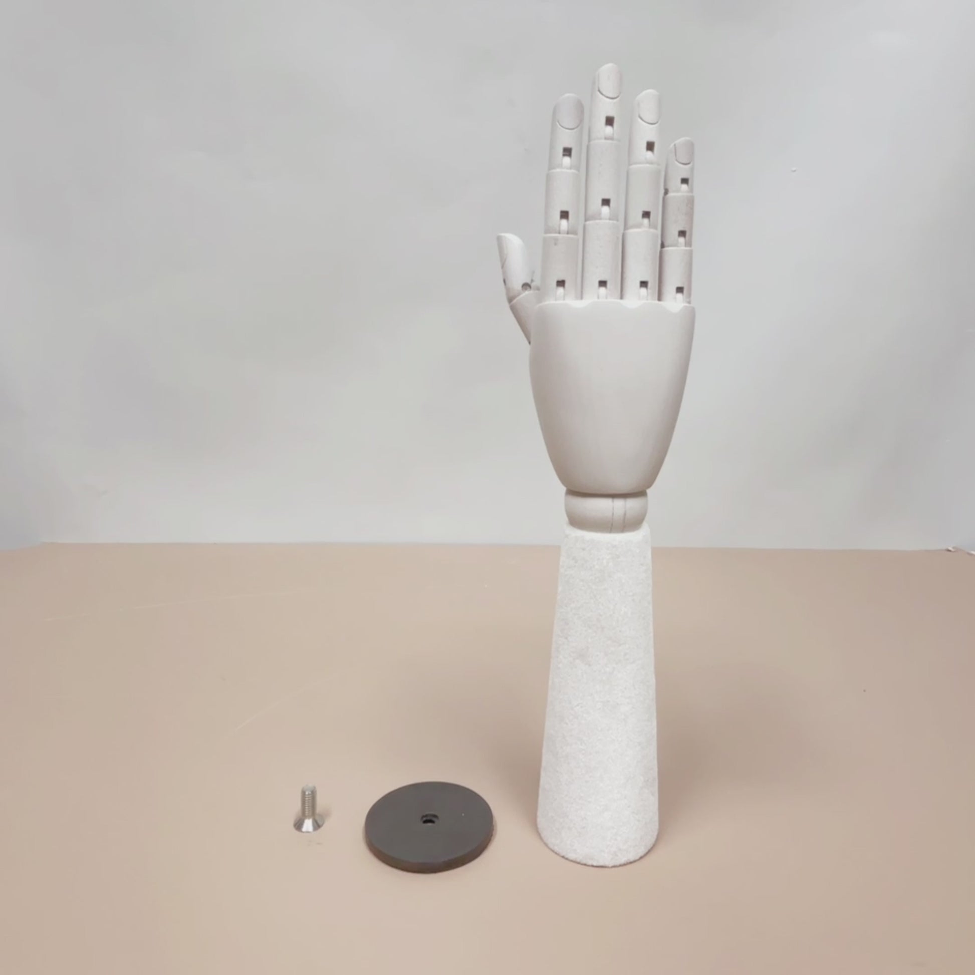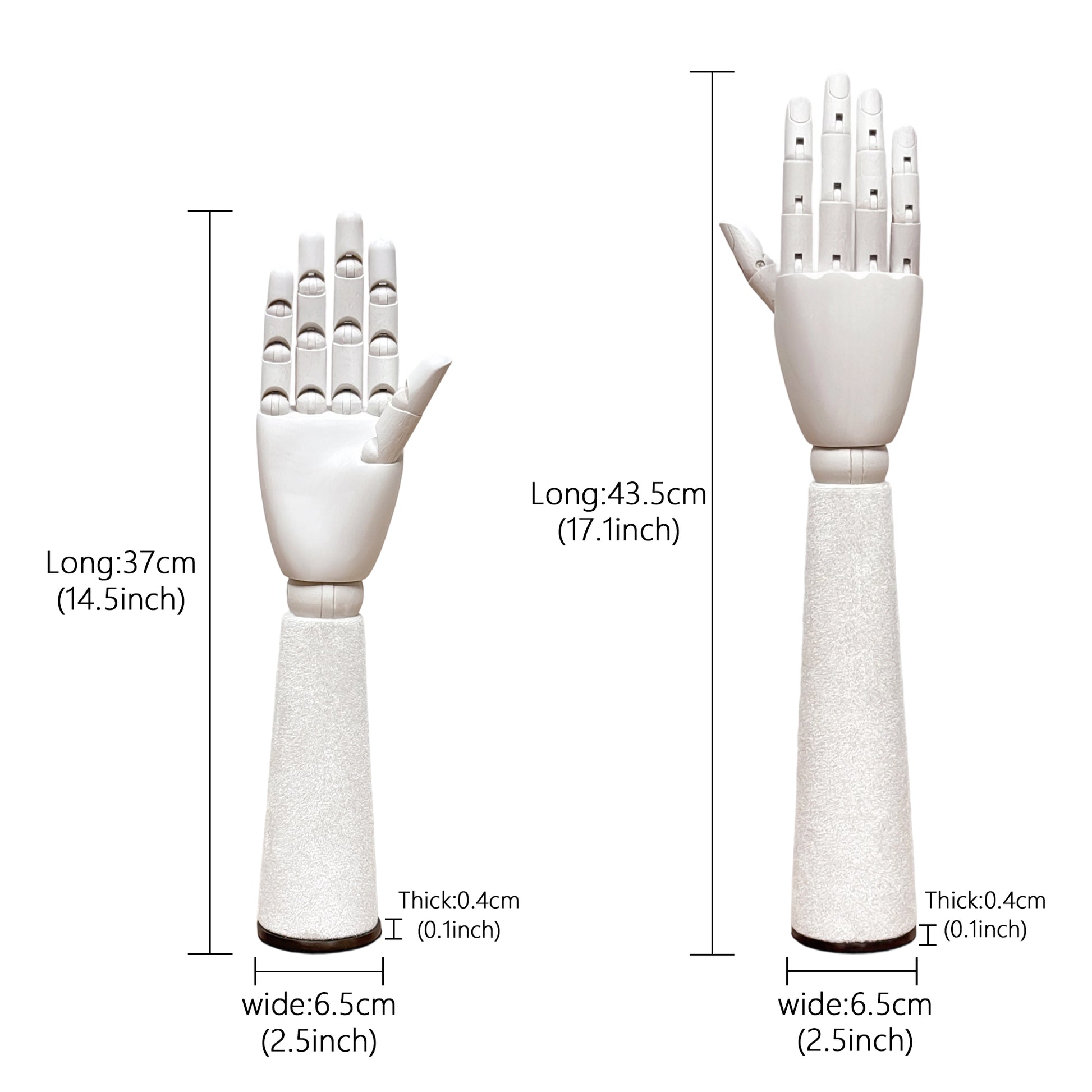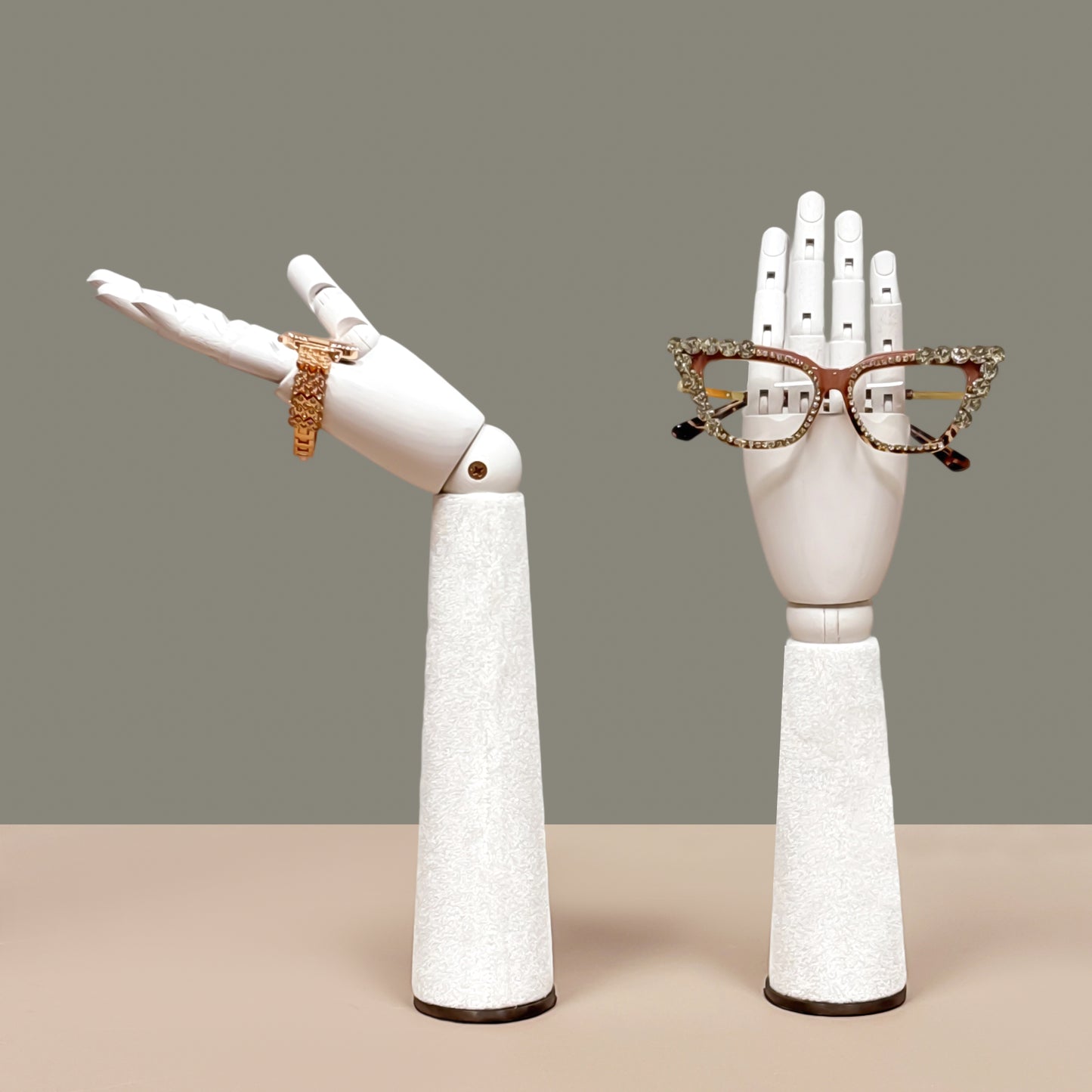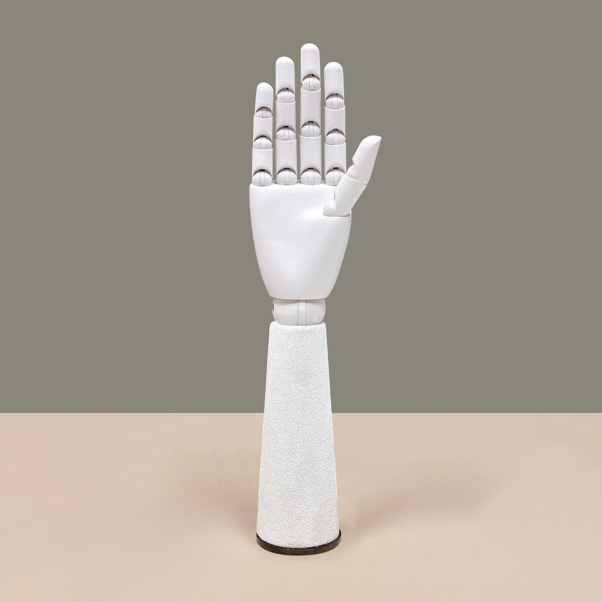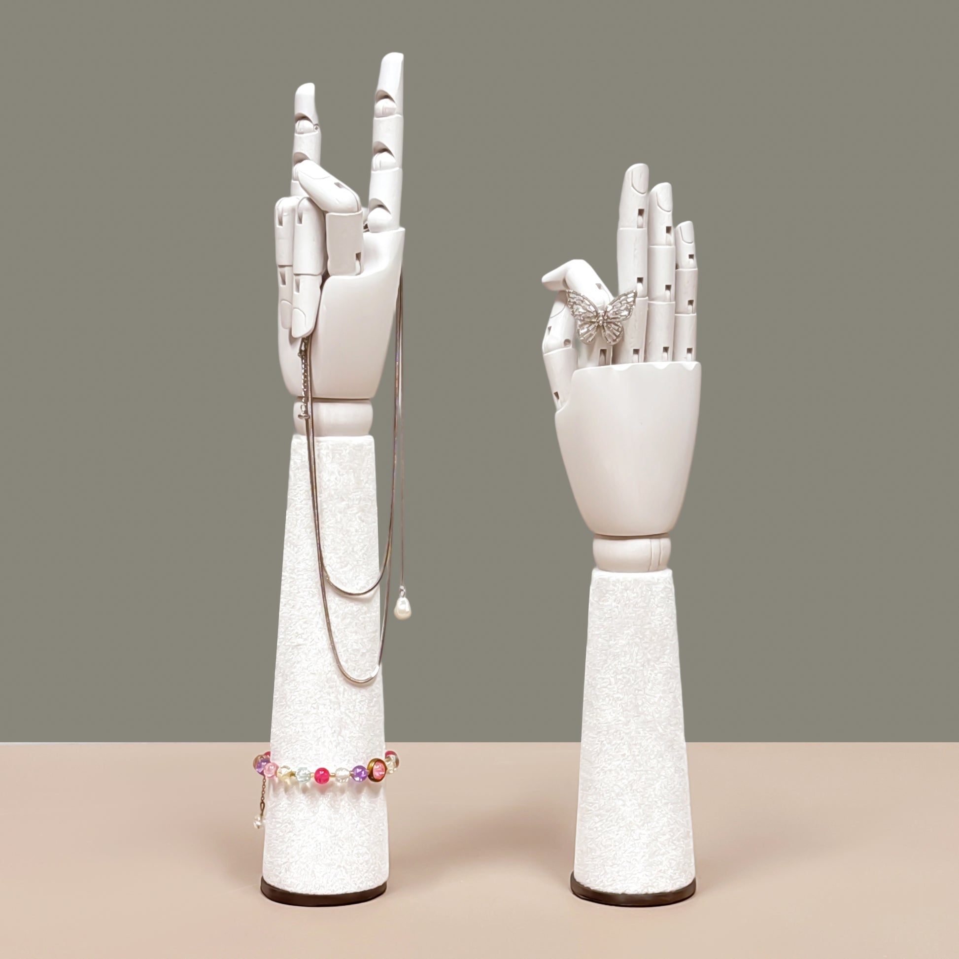The Premium Right Hand Mannequin is made of solid beech wood with a smooth white painted finish and a removable adhesive soft foam stainless steel disc adhesive soft foam base. Wrapped in soft white velvet at the wrist, this elegant mannequin hand is perfect for displaying jewelry, rings, watches, clothing and accessories. Available in two sizes (37 cm and 43.5 cm), it can be used in boutiques, department stores, trade shows and photography studios.