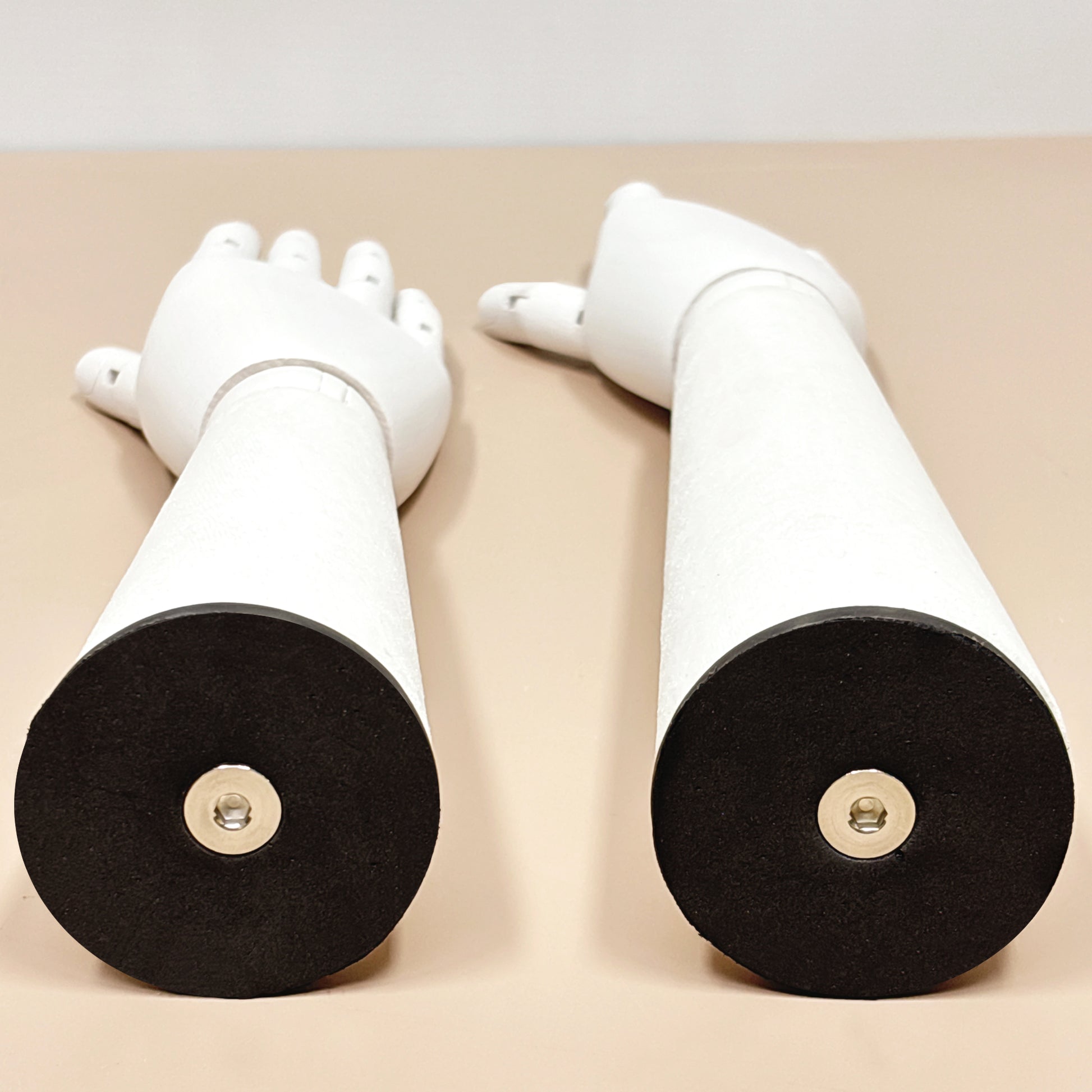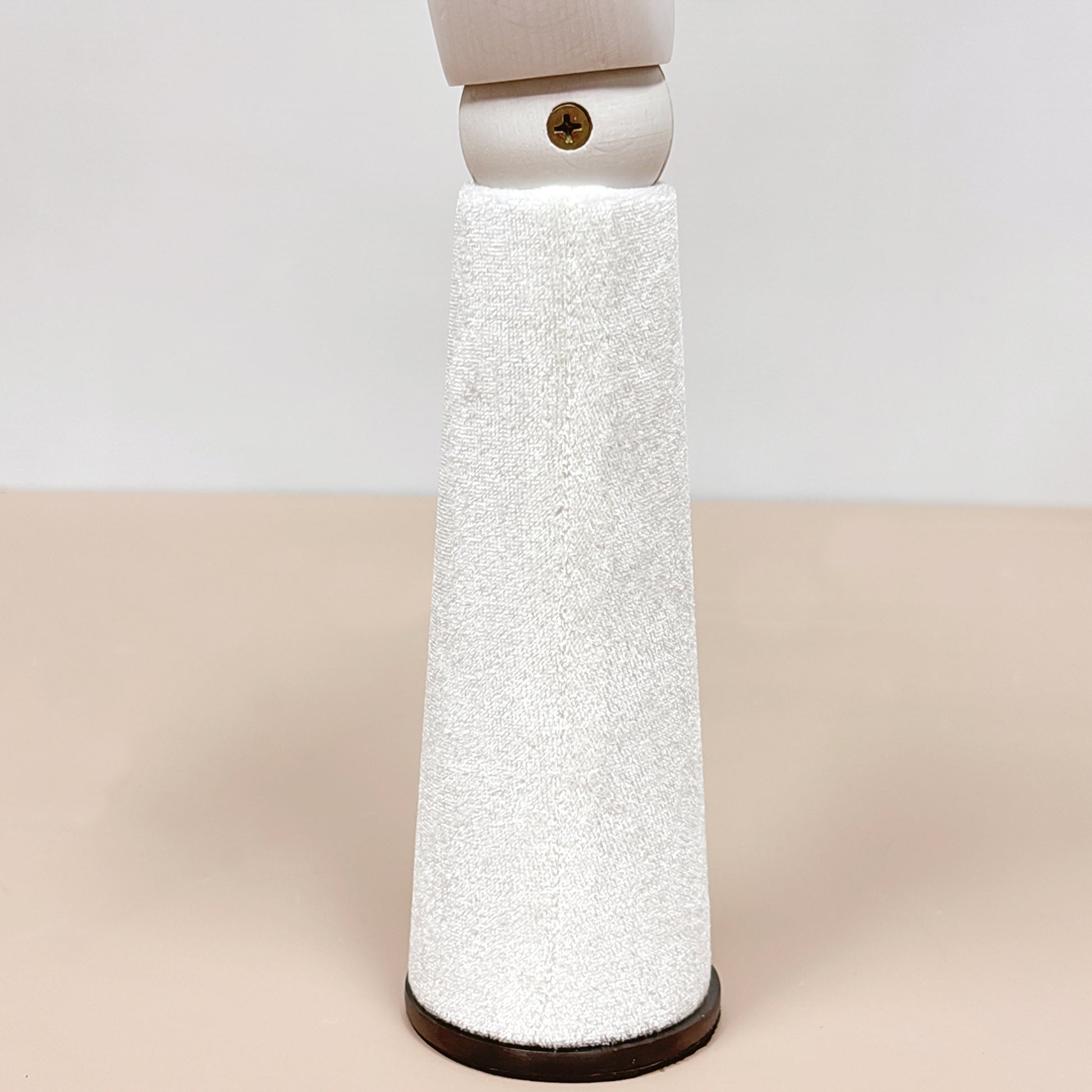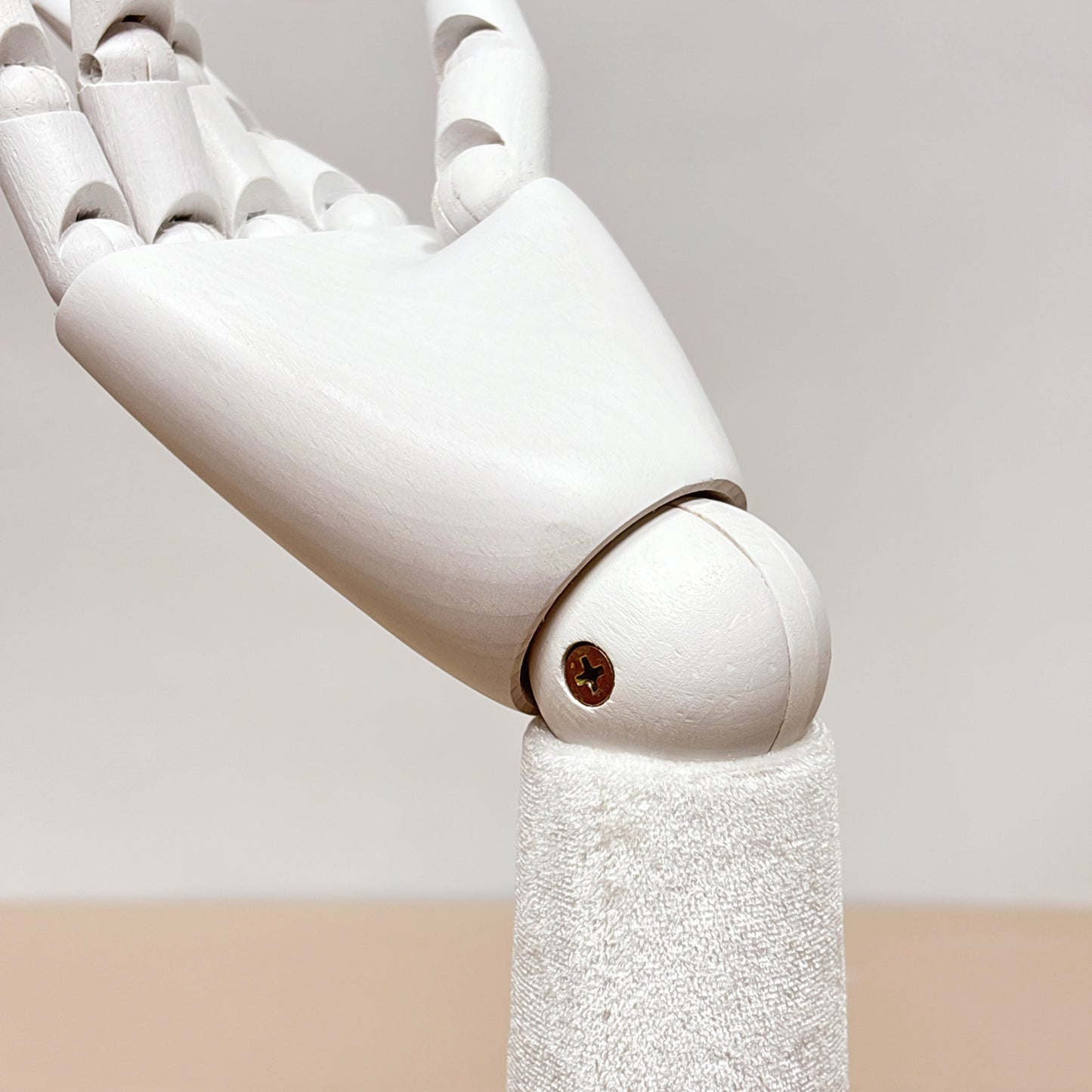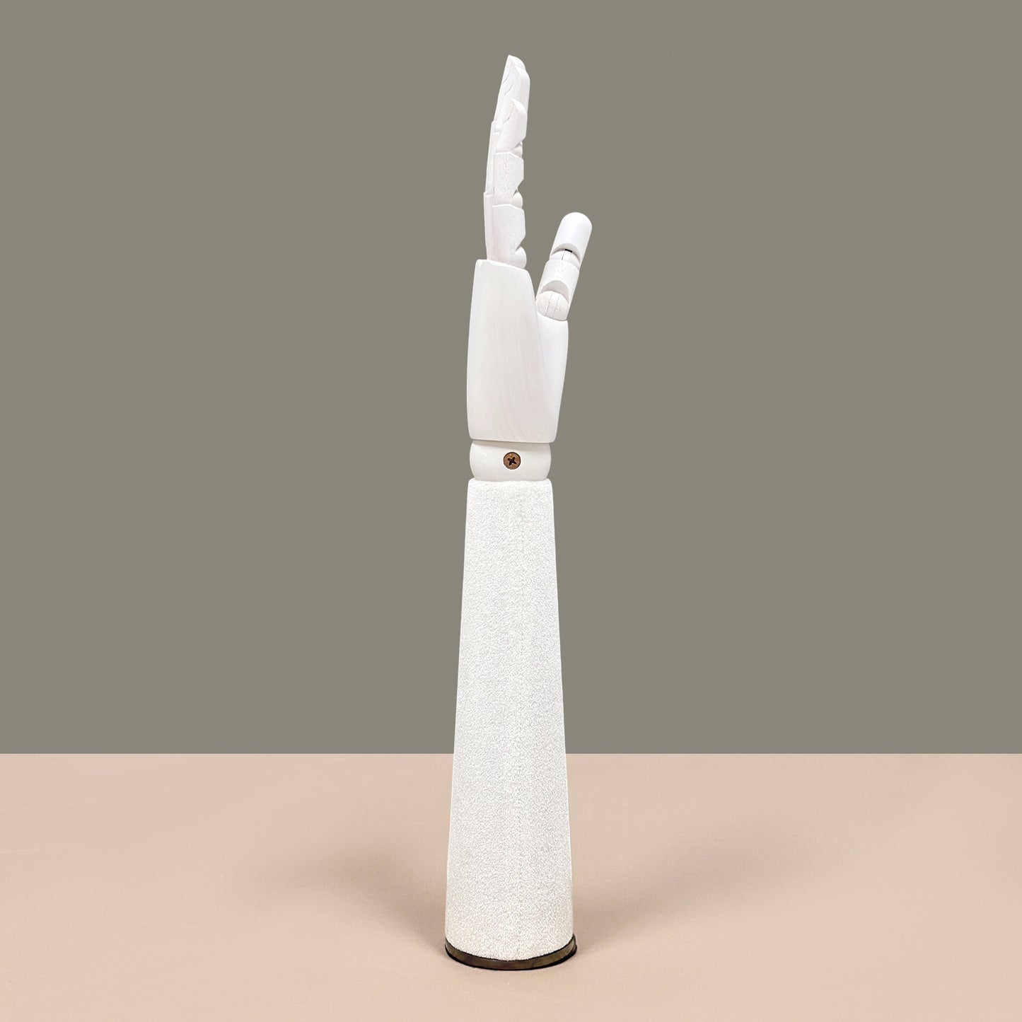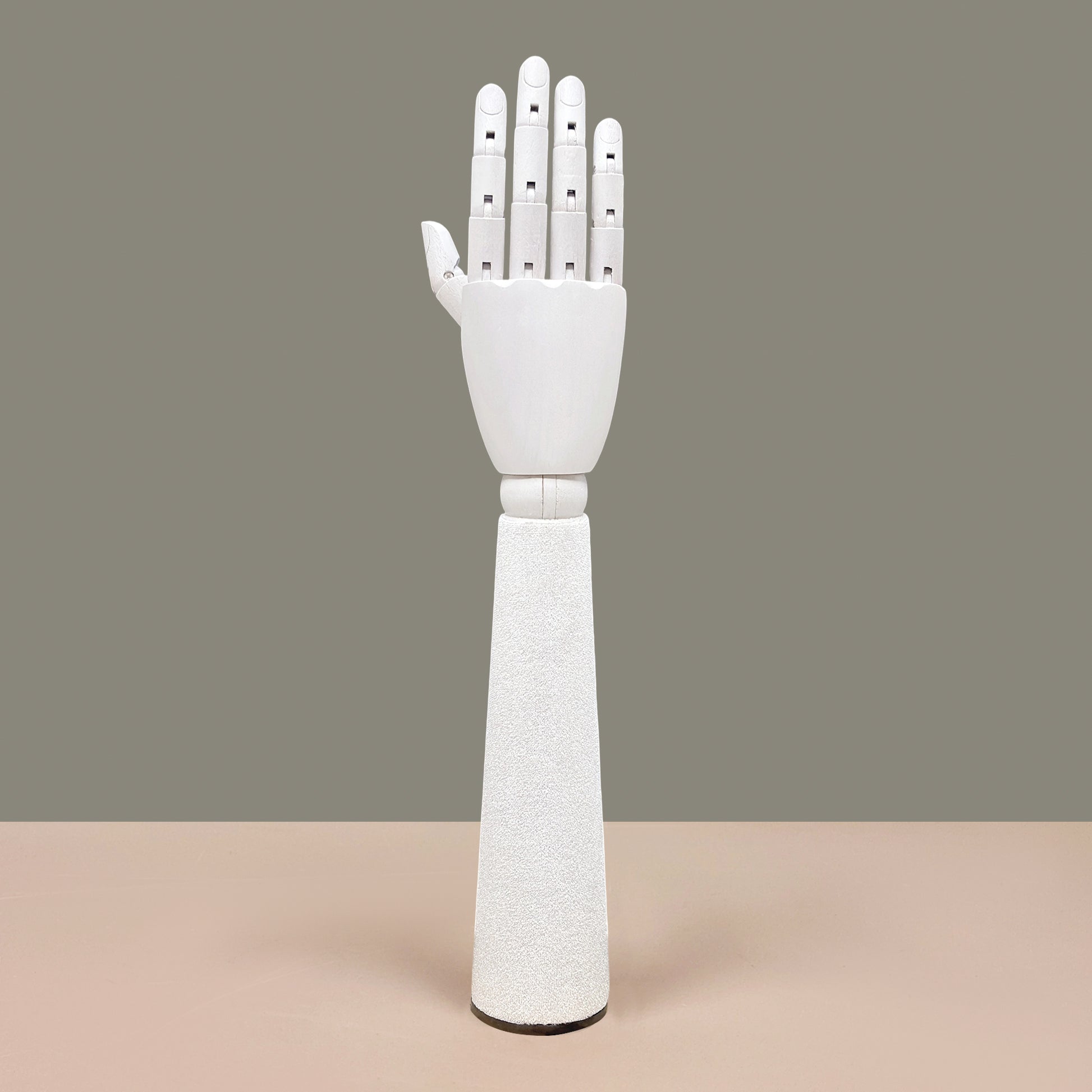 The Premium Right Hand Mannequin is made of solid beech wood with a smooth white painted finish and a removable adhesive soft foam stainless steel disc adhesive soft foam base. Wrapped in soft white velvet at the wrist, this elegant mannequin hand is perfect for displaying jewelry, rings, watches, clothing and accessories. Available in two sizes (37 cm and 43.5 cm), it can be used in boutiques, department stores, trade shows and photography studios.