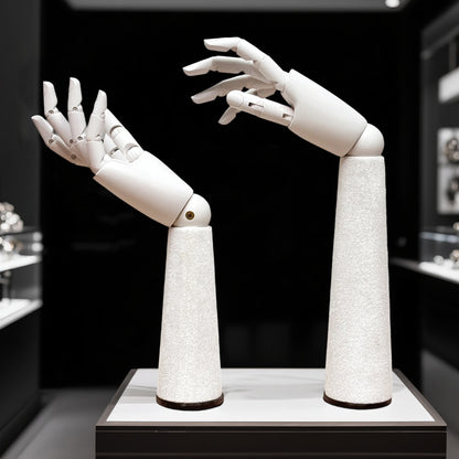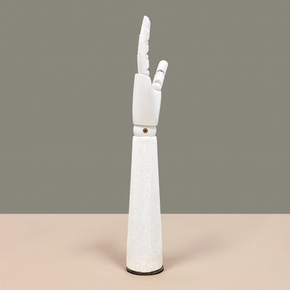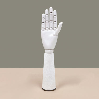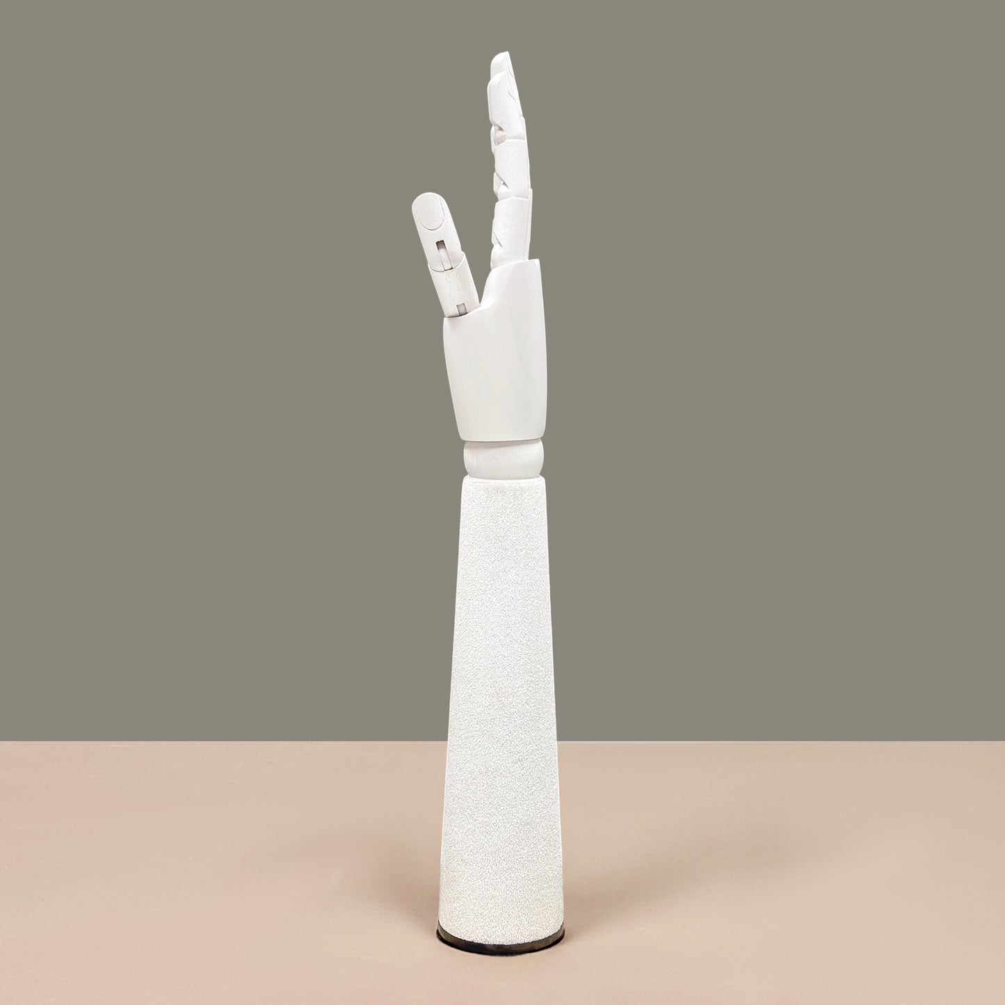 Smooth white spray paint covers the entire hand and is complemented by a soft white velvet wrap around the wrist, providing a luxurious and scratch-free finish to show off your fine jewelry and apparel.